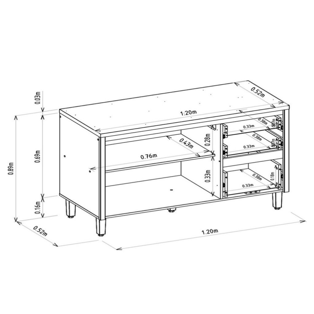 – Três gavetas com corrediças telescópicas