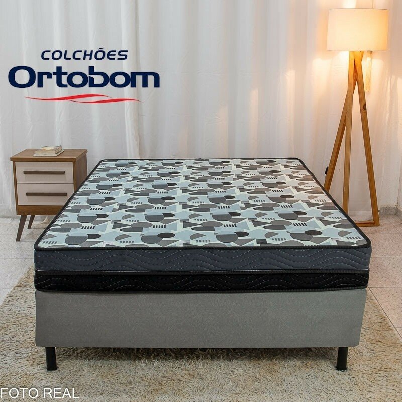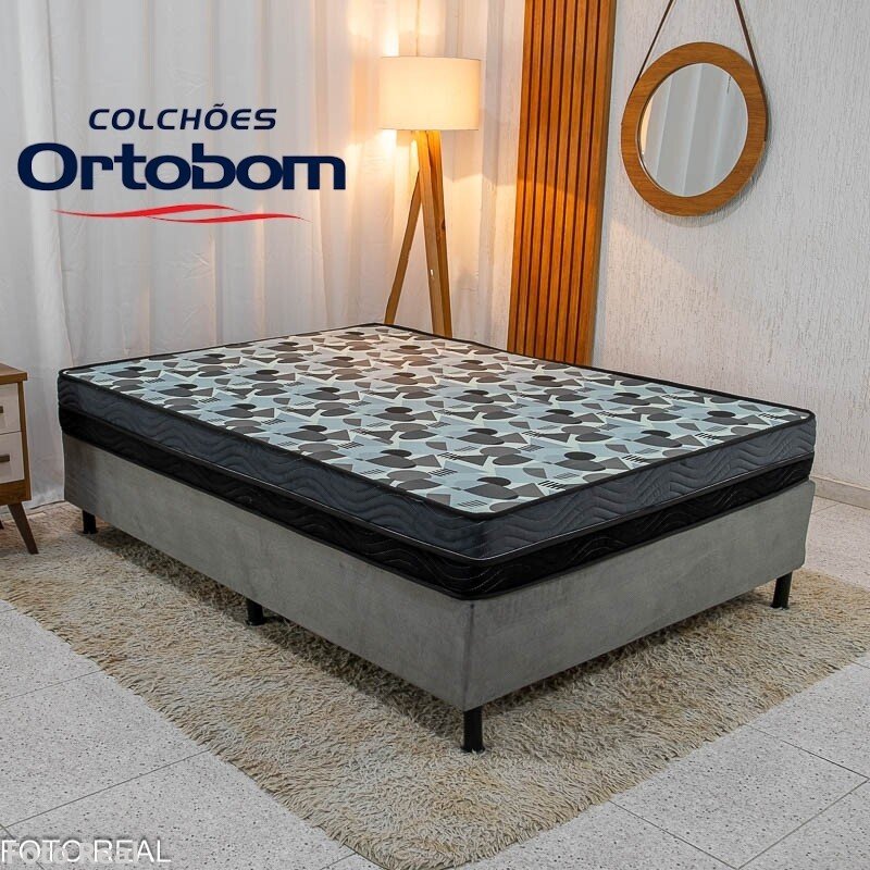 3{%%}Descrição{%%}Box Casal Sued Cinza Nosso Sonho + Colchão Casal Ortopédico EPS Iso Dupla Face D-33 138x188x57 – Ortobom