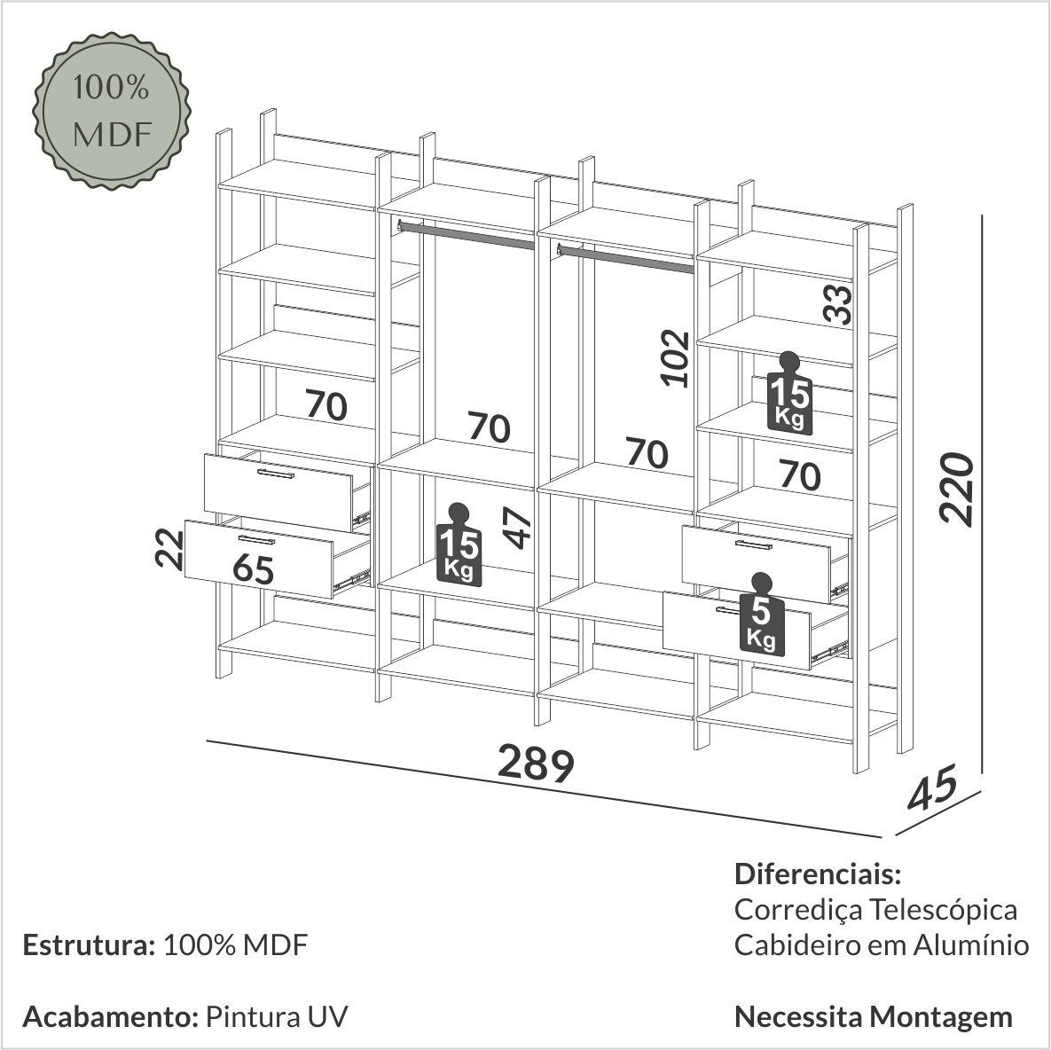 Closet 4 Torres TW406 2,89 m Off White/Freijó – DALLA COSTA
