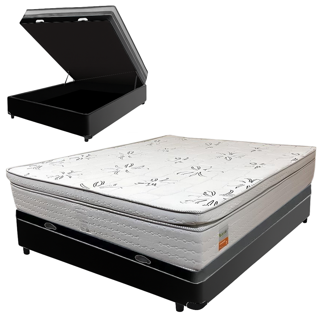 Colchão Casal New York D33 + Base Box Baú Corino Preto – ECOTEC + BIOSTAR