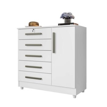 3{%%}Descrição{%%}Cômoda Vitória com 5 Gavetas e 1 Porta Branco Rud Rack