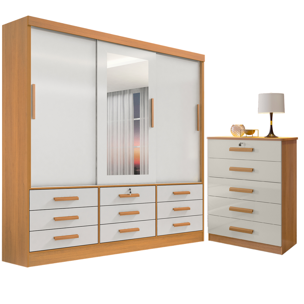 Guarda-Roupa 3 Portas Meridian + Cômoda Ipanema Cinamono/Off White – D’DORO MÓVEIS