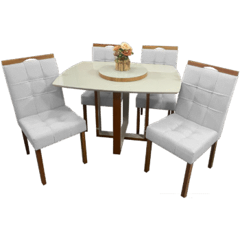 Mesa Atlas Mel/Off White Canto Barril 120×90 com 4 Cadeiras Sophia Mel/Linho Cinza Prata 206 – ART ASSENTOS + WM DECOR