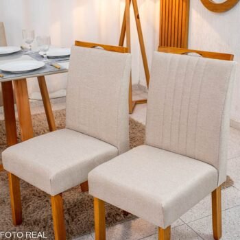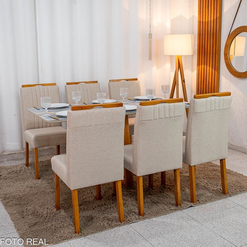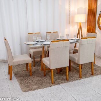 3{%%}Descrição{%%}Mesa de Jantar Bali 160×80 Vidro Off/Base Madeira + 6 Cad. Atlanta Linho Bege Cru Madeira Minas Plac – Entregue Montada