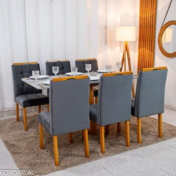 3{%%}Descrição{%%}Mesa de Jantar Bali 160×80 Vidro Off/Base Madeira + 6 Cad. Londres Veludo Chumbo Madeira Minas Plac – Entregue Montada
