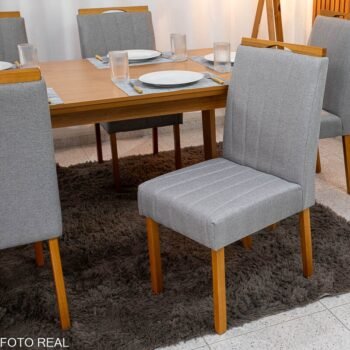 3{%%}Descrição{%%}Mesa de Jantar Londrina 180×90 Cinamomo Rufato + 6 Cad. Isabela Linho Cinza 05 Madeira – KM Decor