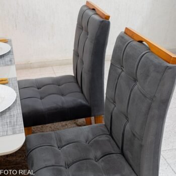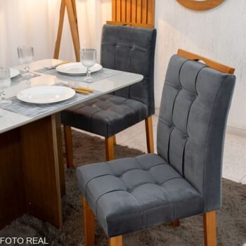 3{%%}Descrição{%%}Mesa de Jantar Moscou 120×80 Vidro Off/Base Cinamomo + 4 Cad. Londres Veludo Chumbo Madeira Minas Plac – Entregue Montada