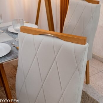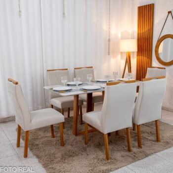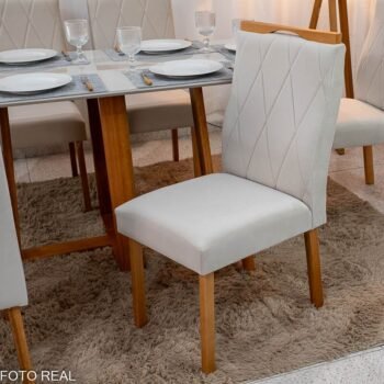3{%%}Descrição{%%}Mesa de Jantar Pedro 160×80 Vidro Off/Base Madeira + 6 Cad. Lisboa Veludo Bege 512 Madeira Art Assento – Entregue Montada