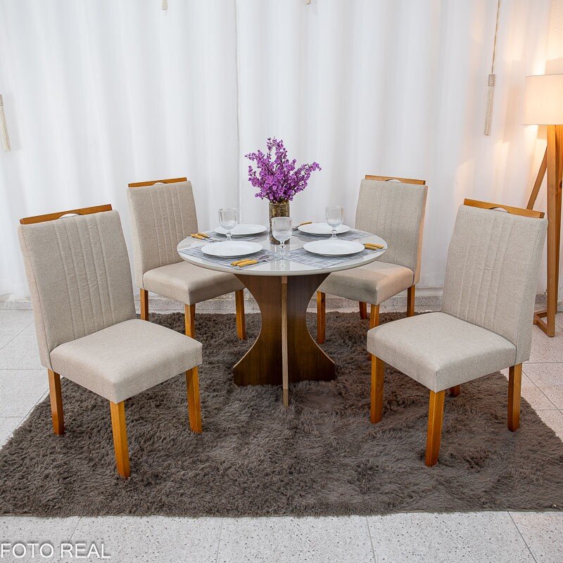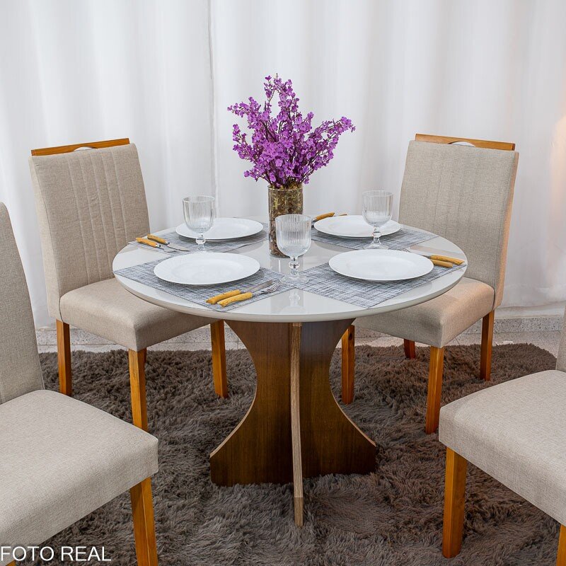 Mesa de Jantar Siena Redonda 100cm Vidro Off/Base Cinamomo + 4 Cad. Atlanta Linho Bege Cru Madeira Minas Plac – Entregue Montada