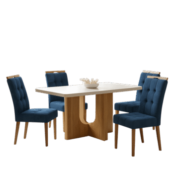 Mesa Dora 120 Cinamono/Off White com 4 Cadeiras Sophia Veludo Azul – VALDEMÓVEIS + WM DECOR