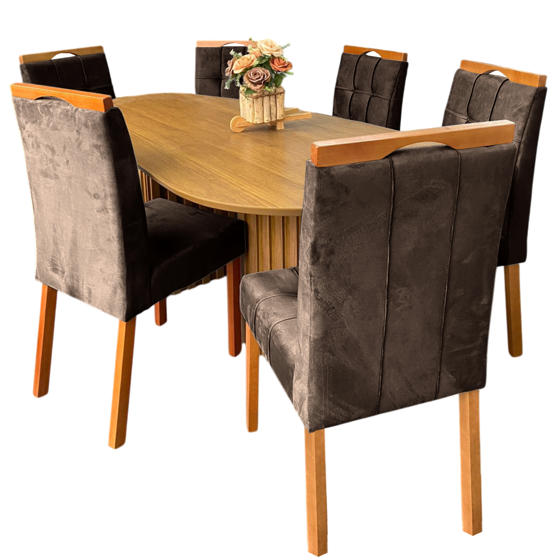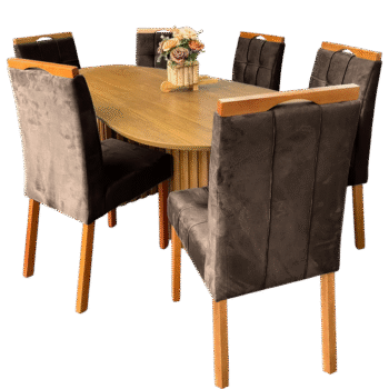 Mesa Isis 180 Freijó com 6 Cadeiras Sophia Veludo Marrom – LEIFER + WM DECOR