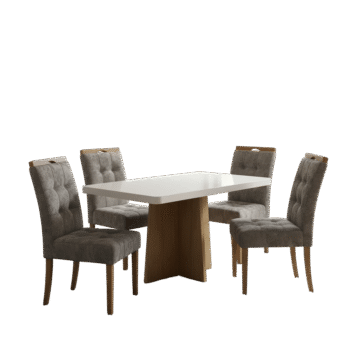 Mesa Jade 120 (Tampo 40 mm) Cinamomo/Off White com 4 Cadeiras Sophia Veludo Cinza Grafite – VALDEMÓVEIS + WM DECOR