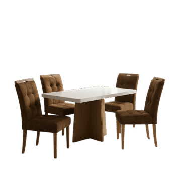 Mesa Jade 120 (Tampo 40 mm) Cinamomo/Off White com 4 Cadeiras Sophia Veludo Marrom – VALDEMÓVEIS + WM DECOR