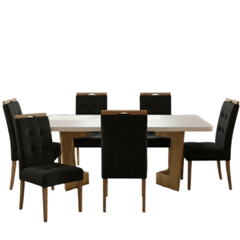 Mesa Liz 160 (Tampo 40 mm) Cinamomo/Off White com 6 Cadeiras Sophia Veludo Preto – VALDEMÓVEIS + WM DECOR