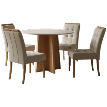 Mesa Redonda Celebrare 100 Amêndoa Clean/Off White com 4 Cadeiras Sophia Veludo Bege – LOPAS + WM DECOR