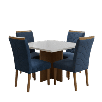 Mesa Salinas 120 Cinamomo/Off White com 4 Cadeiras Safira Veludo Azul – CEL MÓVEIS + WM DECOR