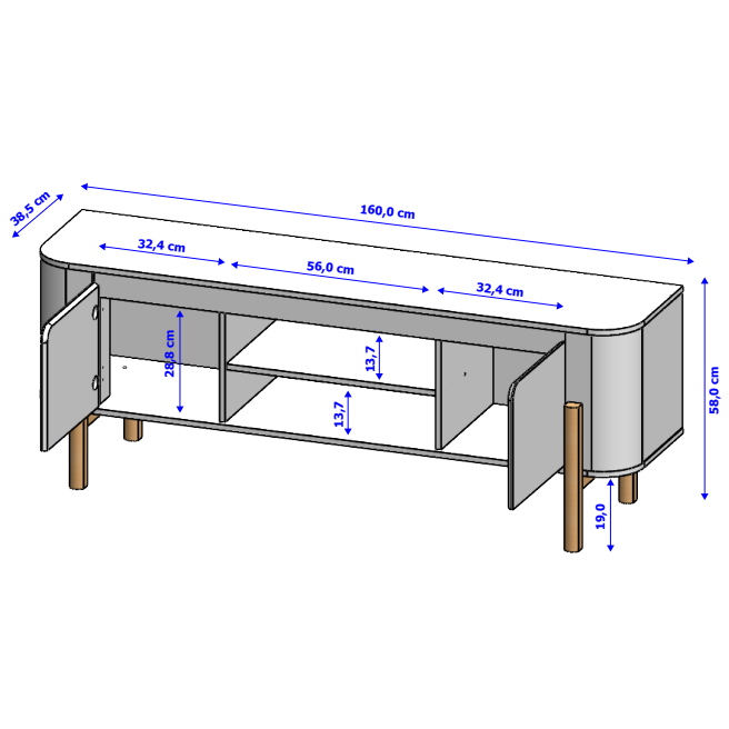 – Tampo, base e portas em MDF de 15 mm de espessura