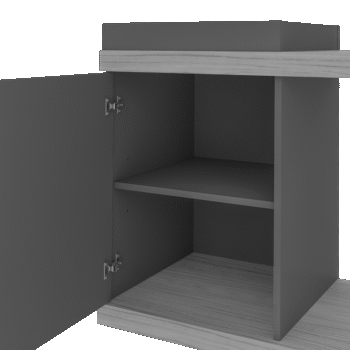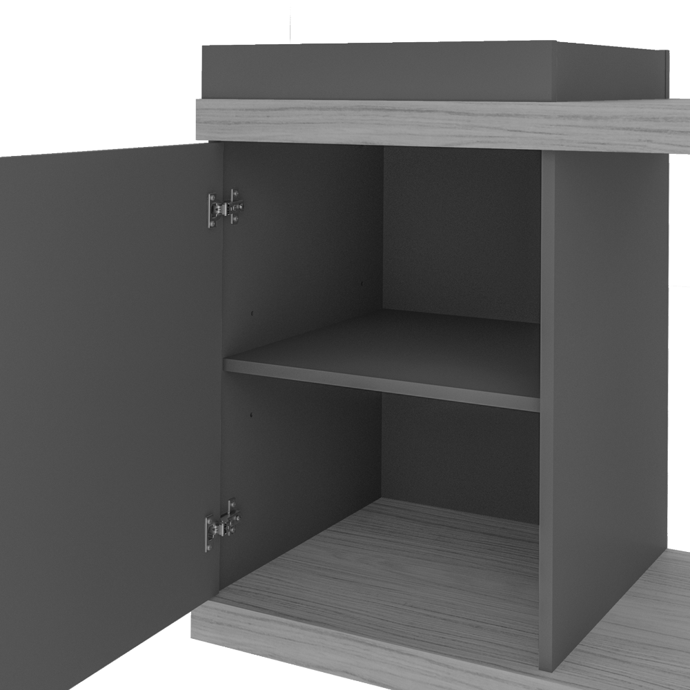 – Acabamento madeirado em pintura UV texturizada, Grafite em pintura UV acetinada, e Off White em pintura UV alto brilho