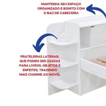 – Prateleira laterais que podem ser usadas para colocar livros, objetos e enfeites. Além disso pode ser montada em ambos os lados da cabeceira.