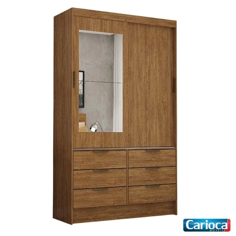 3{%%}Descrição{%%}Roupeiro Solteiro Sevilha Cinamomo 2 Portas C/ 1 Espelho 6 Gavetas Larg. 1.08m – Carioca