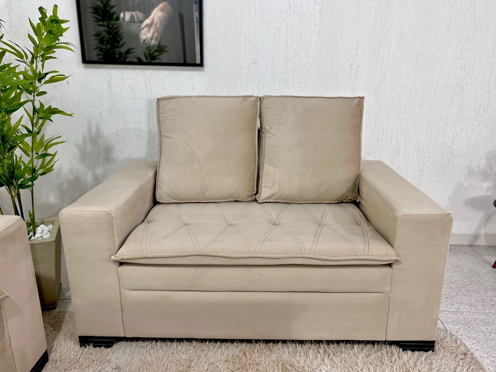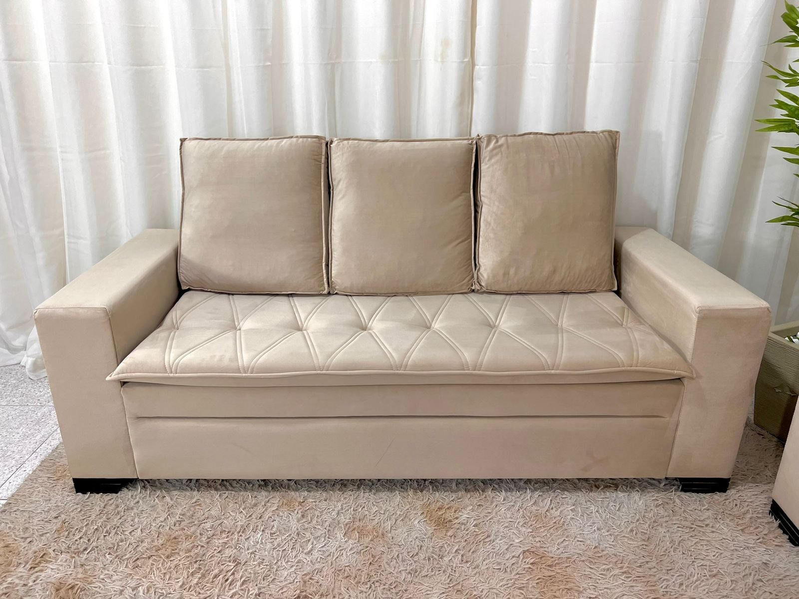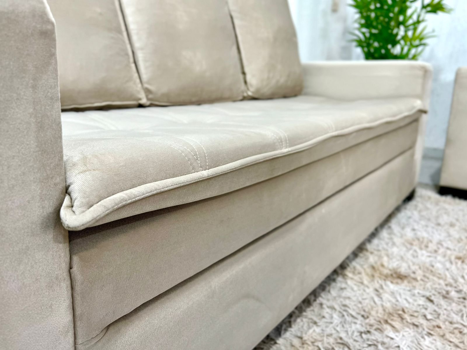 3{%%}Descrição{%%}Sofá 3 e 2 lugares França com Puff Veludo Bege A32 Larg. 1.86m