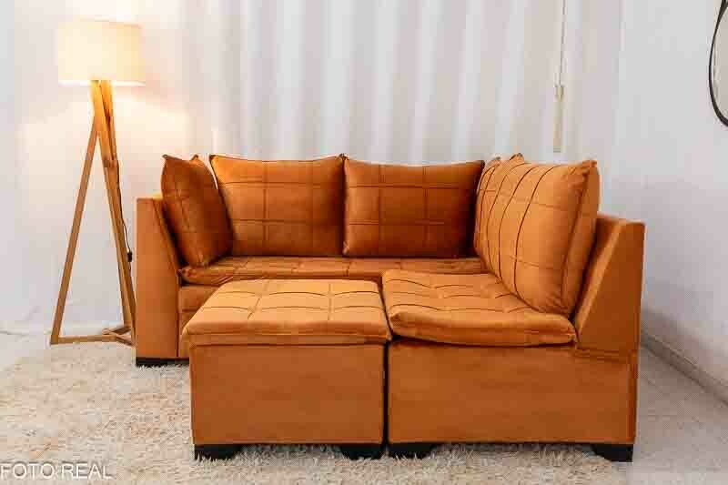 Sofá Canto 5 lugares com Puff Viena Veludo Terracota A62