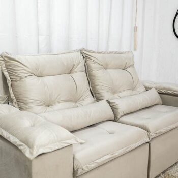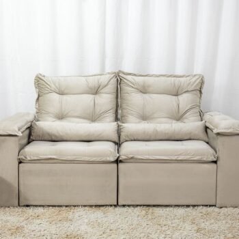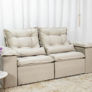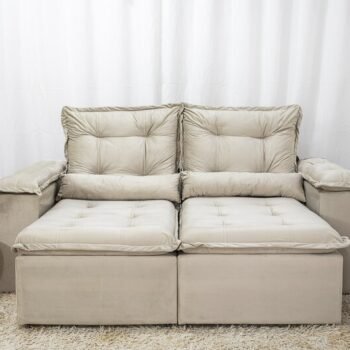 3{%%}Descrição{%%}Sofá Retrátil Reclinável Grécia 2.00m Veludo Bege – Sem caixa