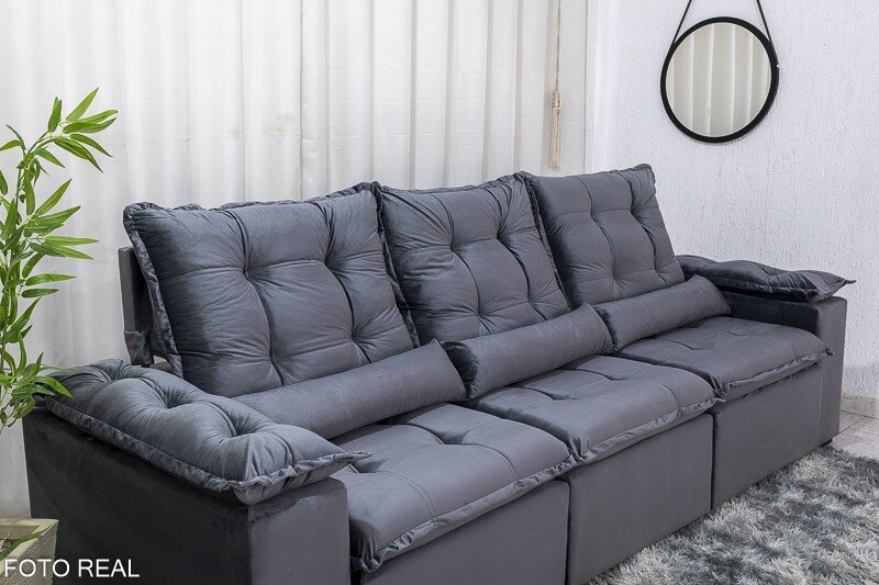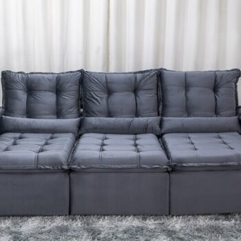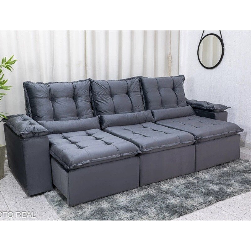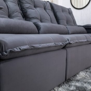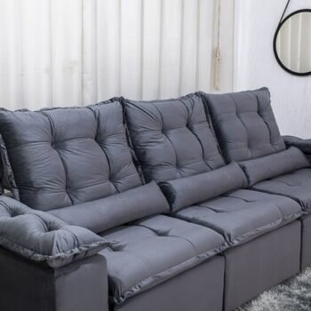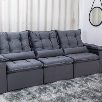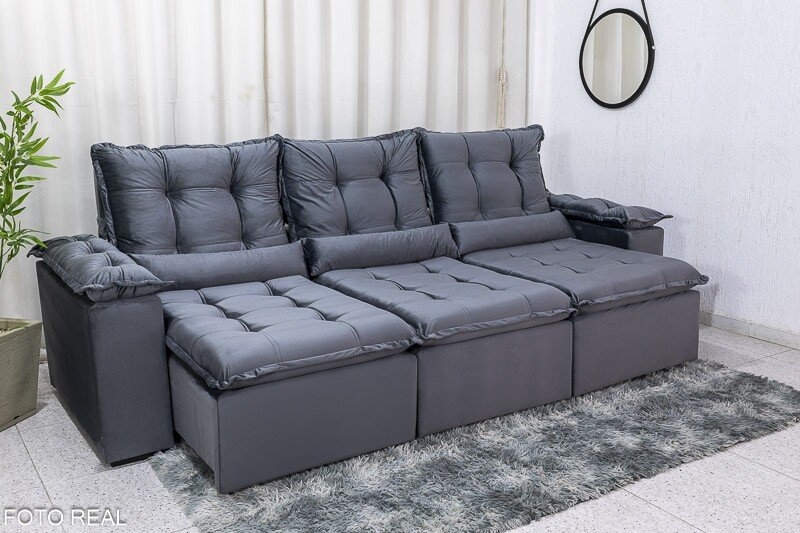 3{%%}Descrição{%%}Sofá Retrátil Reclinável Grécia 2.70m Veludo Cinza – Sem Caixa