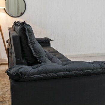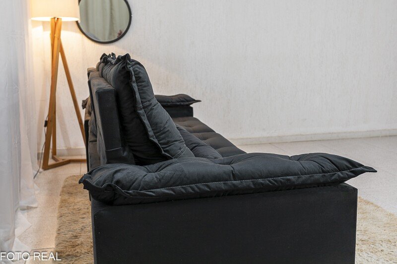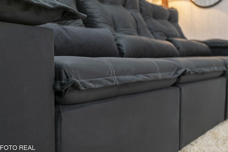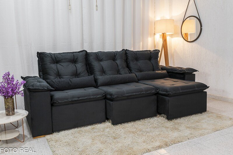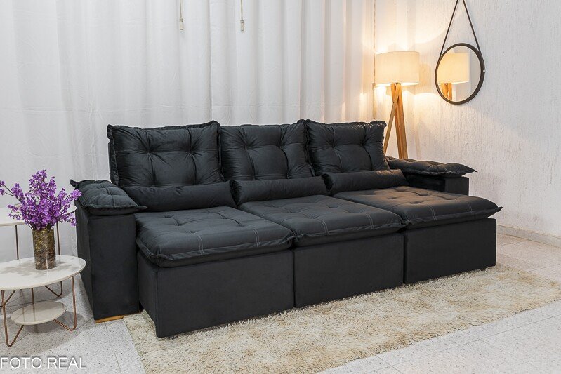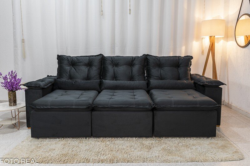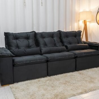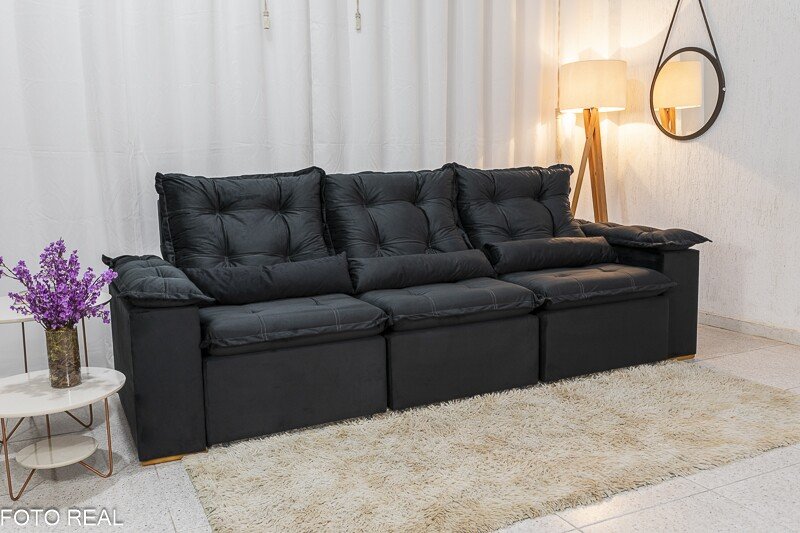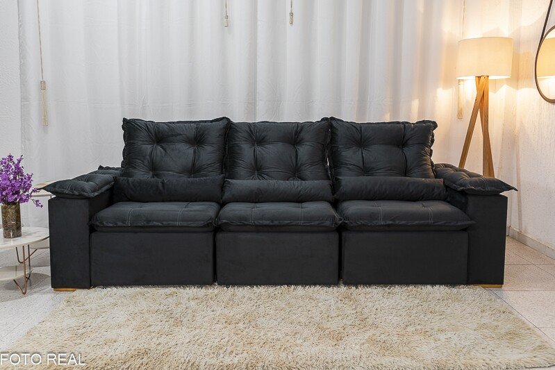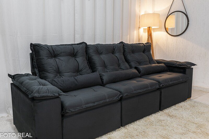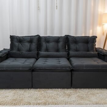 3{%%}Descrição{%%}Sofá Retrátil Reclinável Grécia 2.70m Veludo Preto – Sem Caixa