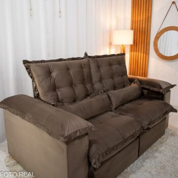 3{%%}Descrição{%%}Sofá Retrátil Reclinável Maldivas 2.10m Veludo Marrom A17 – D28 Pró Aditivada