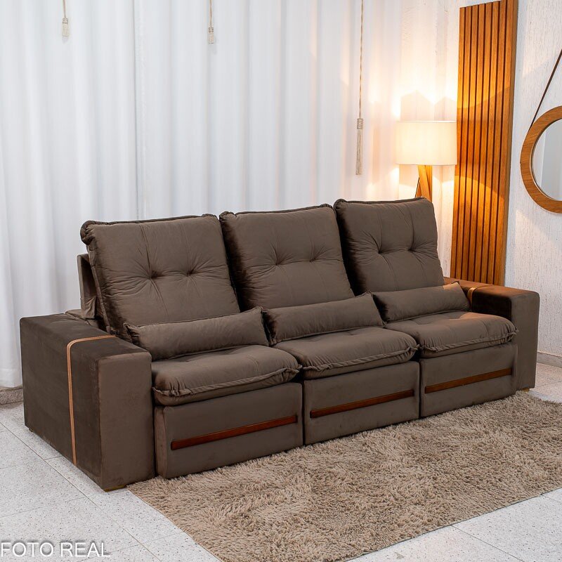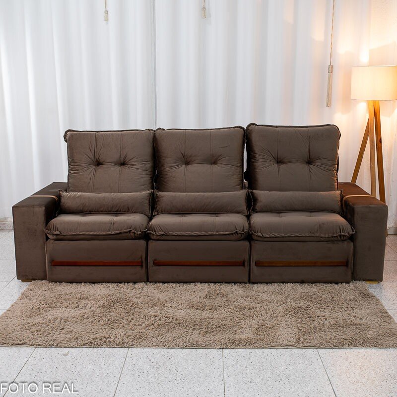 3{%%}Descrição{%%}Sofá Retrátil Reclinável Montreal 2.60m Veludo Marrom – D33