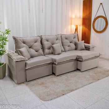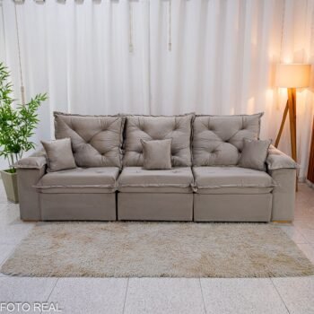 No assento, o conforto é garantido pela espuma D28 Pró Aditivada com 18cm de espessura, sustentação em percintas elásticas e corrediças de ferro com sistema de freio. O encosto é reclinável, com várias posições, e vem com duas almofadas decorativas de brinde, além do braço com pillow top macio, ideal para apoiar os braços ou até deitar.