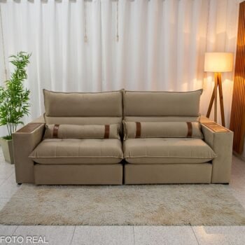 3{%%}Descrição{%%}Sofá Retrátil Reclinável Ravello 2.50m Veludo Bege 3040/04 – Espuma D33