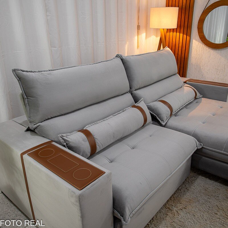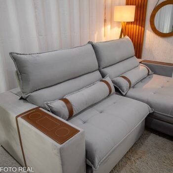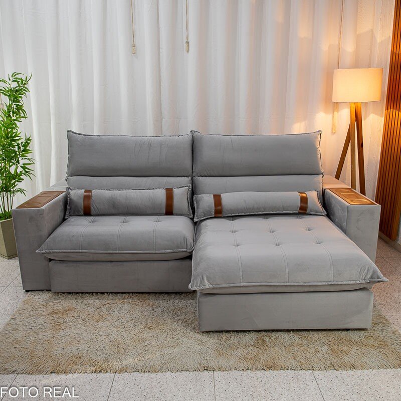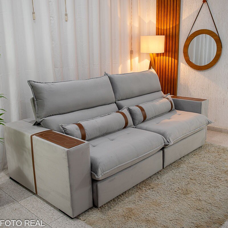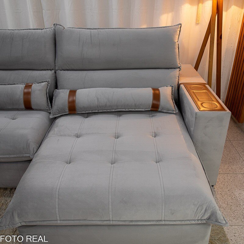 3{%%}Descrição{%%}Sofá Retrátil Reclinável Ravello 2.50m Veludo Prata 3040/03 – Espuma D33