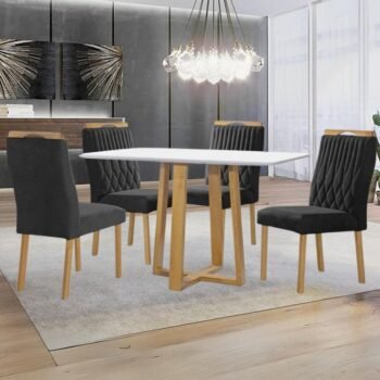 Mesa Pedro 120 Mel/Off White com 4 Cadeiras Gênova Veludo Preto – ART ASSENTOS